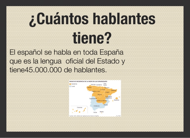 El español se habla en toda España que es la lengua oficial del Estado y tiene45.000.000 de hablantes.