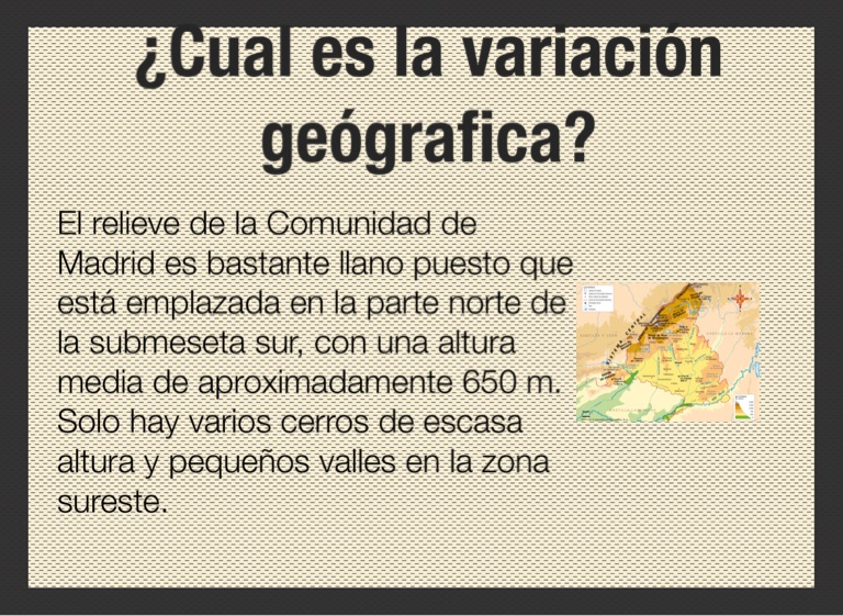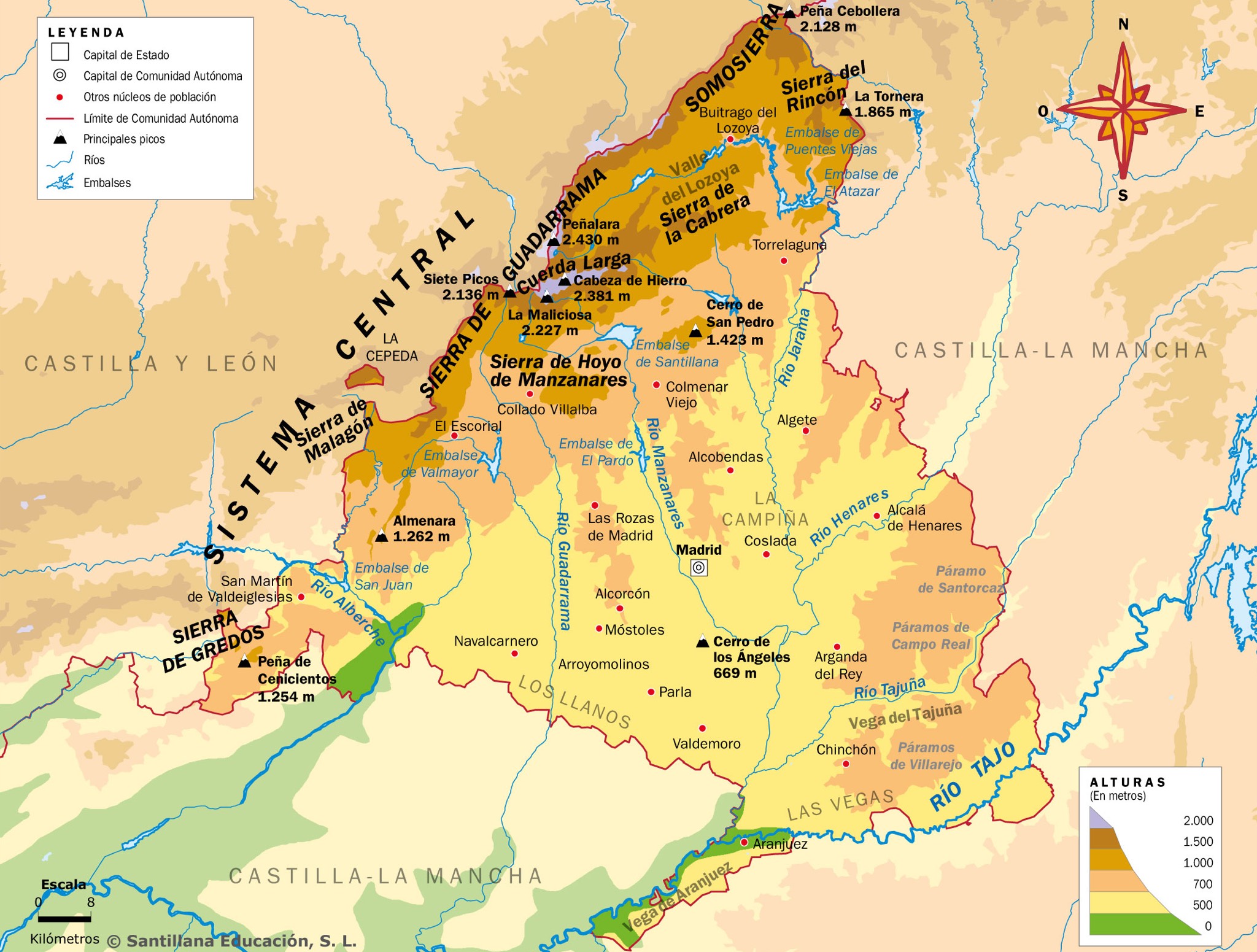 El relieve de la Comunidad de Madrid es bastante llano puesto que está emplazada en la parte norte de la submeseta sur, con una altura media de aproximadamente 650 m. Solo hay varios cerros de escasa altura y pequeños valles en la zona sureste.