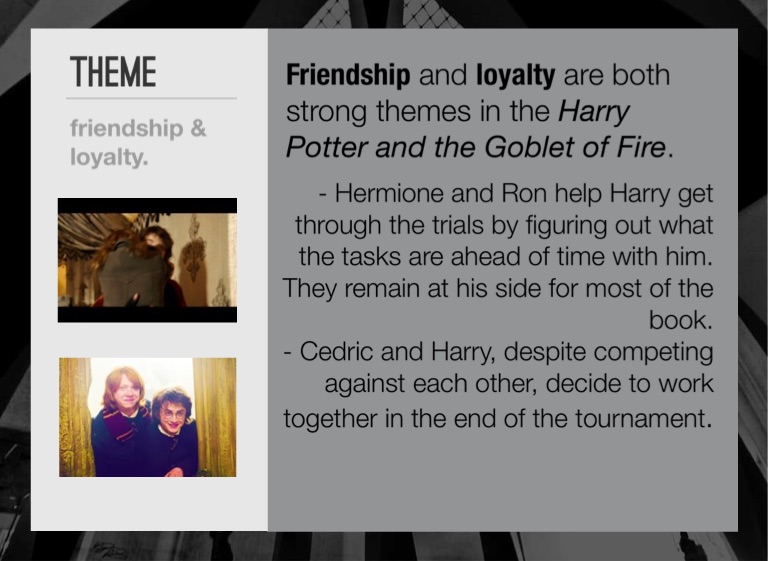 Friendship and loyalty are both strong themes in the Harry Potter and the Goblet of Fire.
