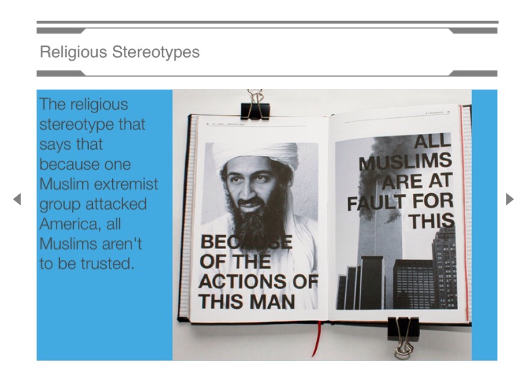 The religious stereotype that says that because one Muslim extremist group attacked America, all Muslims aren't to be trusted.