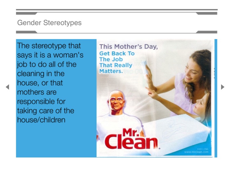 The stereotype that says it is a woman's job to do all of the cleaning in the house, or that mothers are responsible for taking care of the house/children