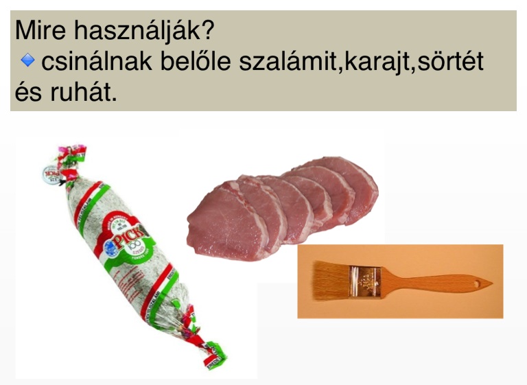 🔹csinálnak belőle szalámit,karajt,sörtét és ruhát.