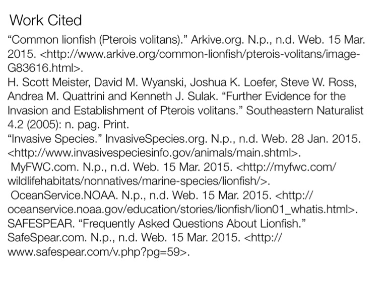 MyFWC.com. N.p., n.d. Web. 15 Mar. 2015. <http://myfwc.com/wildlifehabitats/nonnatives/marine-species/lionfish/>.