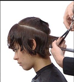 Section hair into 6 sections,create a vertical subsection at the center back of the head,use small teeth of the comb for control,direct hair vertically from the subsection,angling fingers determines the amount of graduation,take the next subsection diagonally as you move away from center guide elevation drops,take a new subsection,pick up small portion of previous guide if it don't reach don't cut it,elevation is lowered in this subsection direct hair down to the previous and keep fingers angled and cut the next subsection pivot as you move to the round of the head, hair is directed back to the guide as you move to the side perimeter hair is directed back to the curve of the head continue this process to the front hairline,drop top section now separate the front from the back at center back establish a vertical subsection pick up some of the guide below angel your fingers elevation is slightly higher pivot sections from the crown until you reach the parting that separates the front from the back,repeat same process on other side