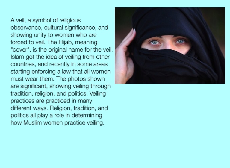 A veil, a symbol of religious observance, cultural significance, and showing unity to women who are forced to veil. The Hijab, meaning "cover", is the original name for the veil. Islam got the idea of veiling from other countries, and recently in some areas starting enforcing a law that all women must wear them. The photos shown are significant, showing veiling through tradition, religion, and politics. Veiling practices are practiced in many different ways. Religion, tradition, and politics all play a role in determining how Muslim women practice veiling.