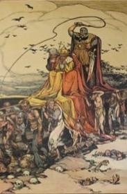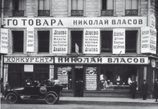 O proprietário Nikolai Vlasov e a esposa, no automóvel, em frente do seu estabelecimento comercial. Entre as janelas pode ler-se, repetidamente, «ДЕШЕВО» – «É barato».