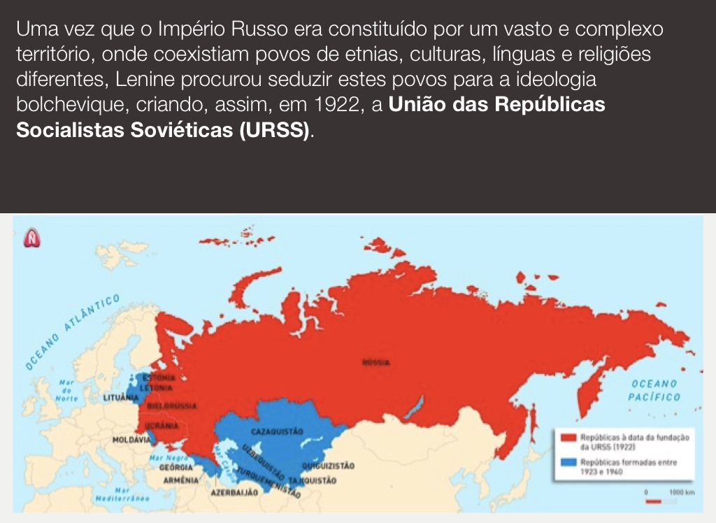 Uma vez que o Império Russo era constituído por um vasto e complexo território, onde coexistiam povos de etnias, culturas, línguas e religiões diferentes, Lenine procurou seduzir estes povos para a ideologia bolchevique, criando, assim, em 1922, a União das Repúblicas Socialistas Soviéticas (URSS).