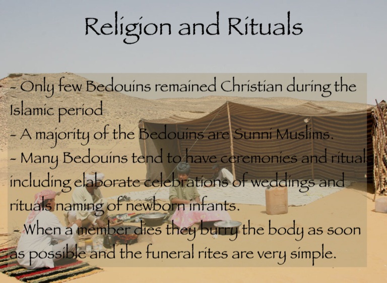 - Many Bedouins tend to have ceremonies and rituals including elaborate celebrations of weddings and rituals naming of newborn infants.