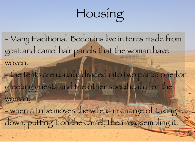 - when a tribe moves the wife is in charge of taking it down, putting it on the camel, then reassembling it.
