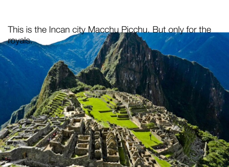 This is the Incan city Macchu Picchu. But only for the royals.