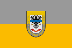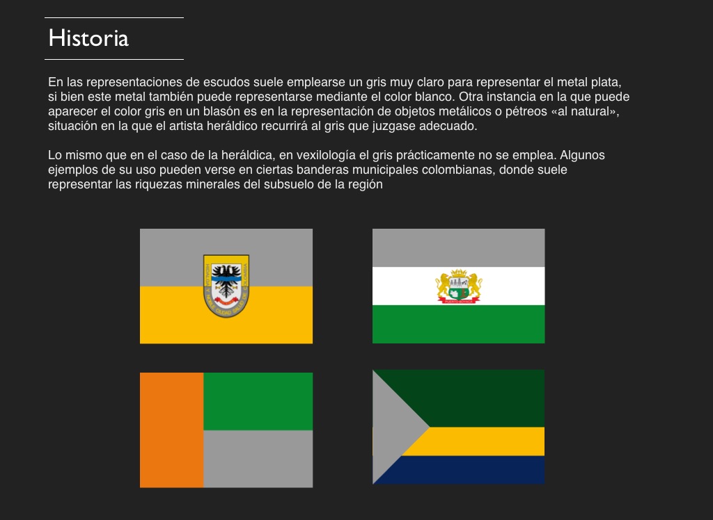 Lo mismo que en el caso de la heráldica, en vexilología el gris prácticamente no se emplea. Algunos ejemplos de su uso pueden verse en ciertas banderas municipales colombianas, donde suele representar las riquezas minerales del subsuelo de la región