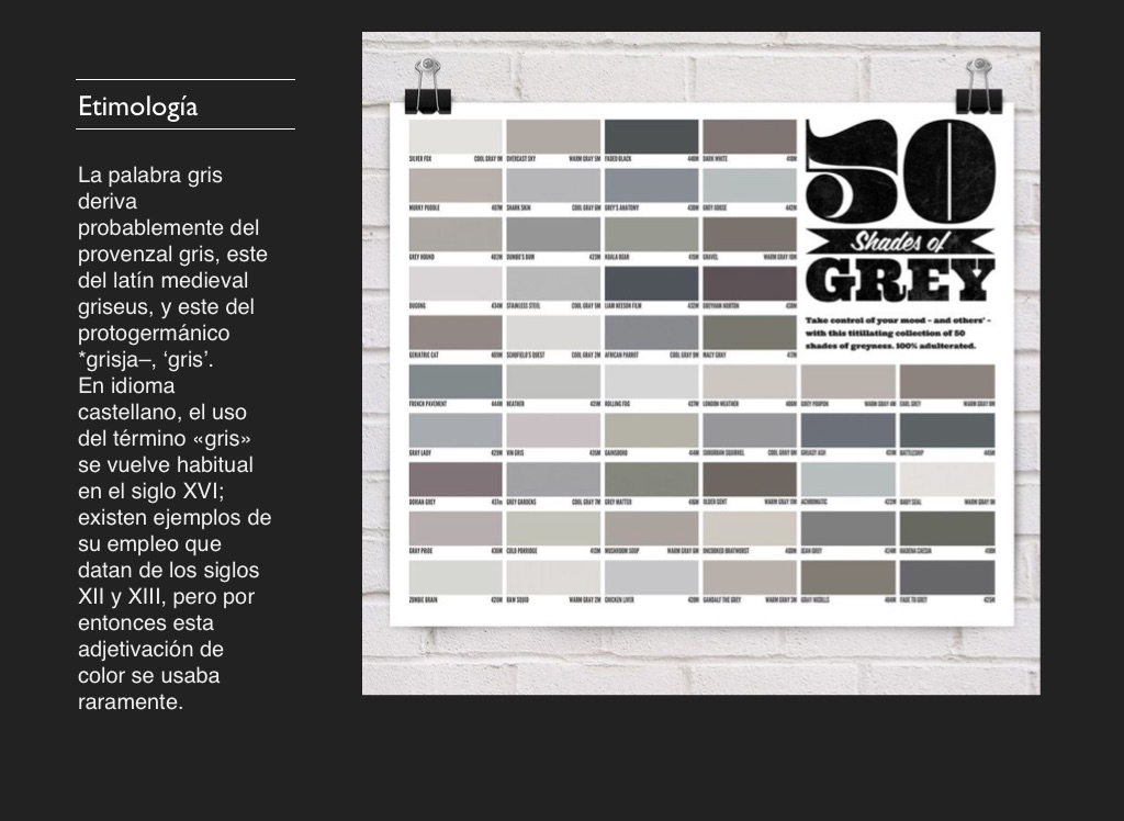 En idioma castellano, el uso del término «gris» se vuelve habitual en el siglo XVI; existen ejemplos de su empleo que datan de los siglos XII y XIII, pero por entonces esta adjetivación de color se usaba raramente.