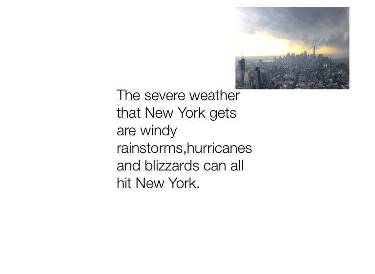 The severe weather that New York gets are windy rainstorms,hurricanes and blizzards can all hit New York.