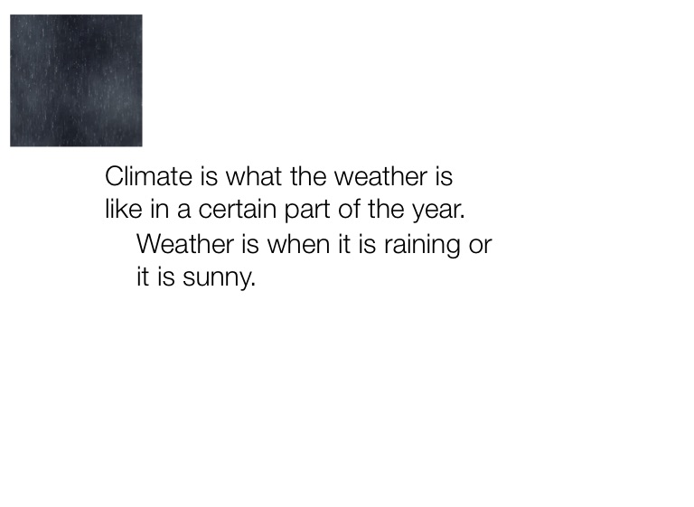 Climate is what the weather is like in a certain part of the year.