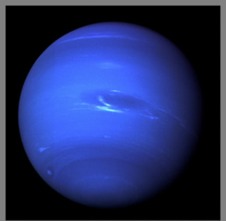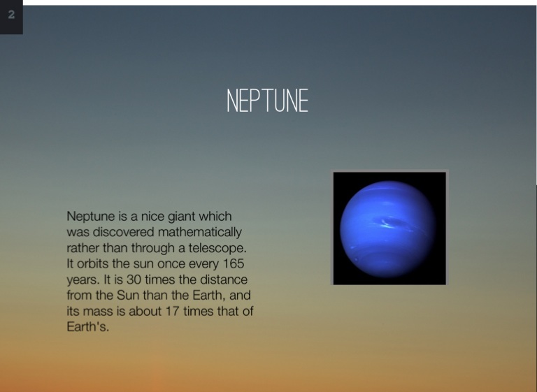 Neptune is a nice giant which was discovered mathematically rather than through a telescope. It orbits the sun once every 165 years. It is 30 times the distance from the Sun than the Earth, and its mass is about 17 times that of Earth's.