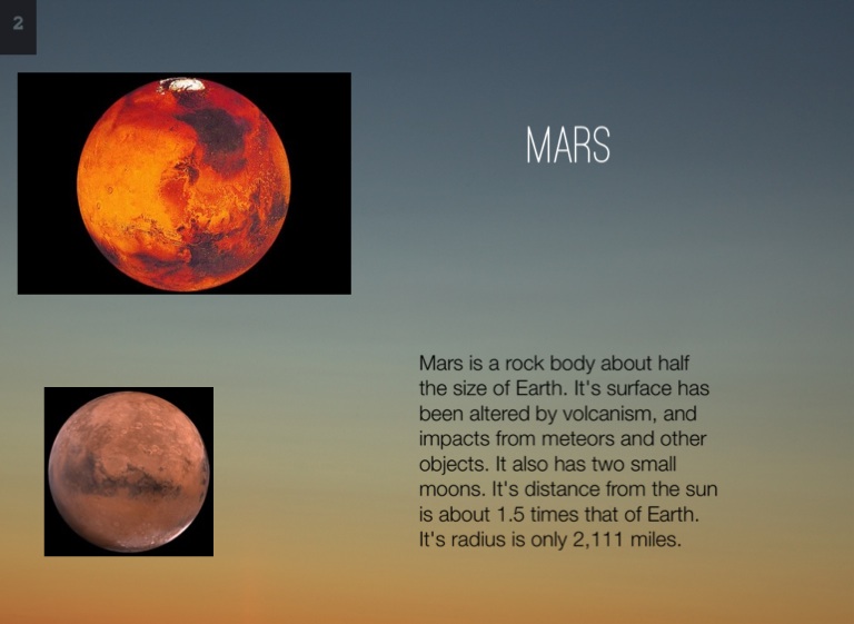 Mars is a rock body about half the size of Earth. It's surface has been altered by volcanism, and impacts from meteors and other objects. It also has two small moons. It's distance from the sun is about 1.5 times that of Earth. It's radius is only 2,111 miles.