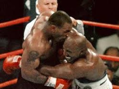 The rematch between heavyweight boxers Mike Tyson and Evander Holyfield ended in disgrace as the former bit out a chunk of the latter's ear.