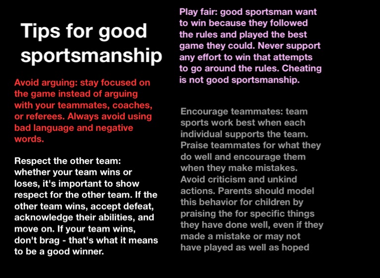 Play fair: good sportsman want to win because they followed the rules and played the best game they could. Never support any effort to win that attempts to go around the rules. Cheating is not good sportsmanship.