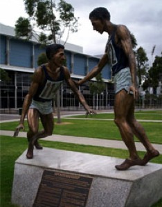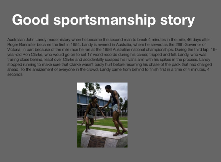 Australian John Landy made history when he became the second man to break 4 minutes in the mile, 46 days after Roger Bannister became the first in 1954. Landy is revered in Australia, where he served as the 26th Governor of Victoria, in part because of the mile race he ran at the 1956 Australian national championships. During the third lap, 19-year-old Ron Clarke, who would go on to set 17 world records during his career, tripped and fell. Landy, who was trailing close behind, leapt over Clarke and accidentally scraped his rival's arm with his spikes in the process. Landy stopped running to make sure that Clarke wasn't badly hurt before resuming his chase of the pack that had charged ahead. To the amazement of everyone in the crowd, Landy came from behind to finish first in a time of 4 minutes, 4 seconds.