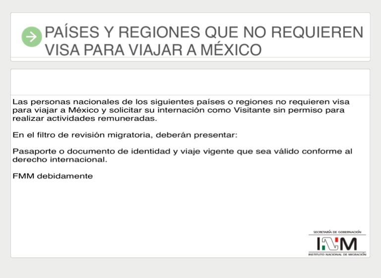 Las personas nacionales de los siguientes países o regiones no requieren visa para viajar a México y solicitar su internación como Visitante sin permiso para realizar actividades remuneradas.