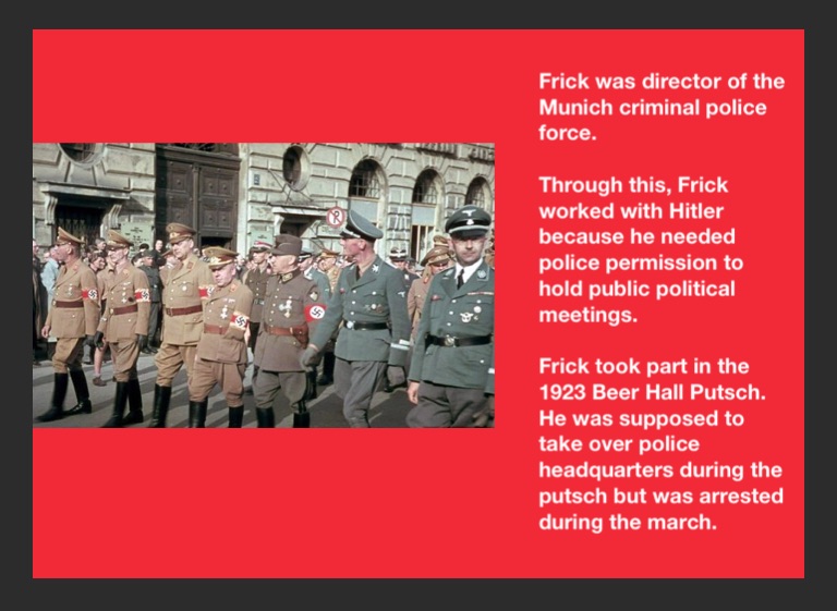 Frick took part in the 1923 Beer Hall Putsch. He was supposed to take over police headquarters during the putsch but was arrested during the march.