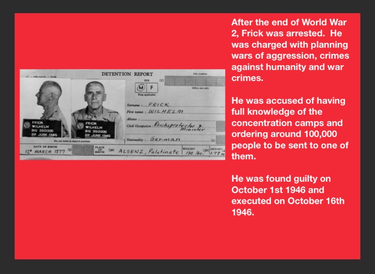 After the end of World War 2, Frick was arrested. He was charged with planning wars of aggression, crimes against humanity and war crimes.