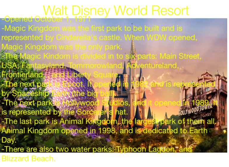 -Magic Kingdom was the first park to be built and is represented by Cinderella's castle. When WDW opened, Magic Kingdom was the only park.