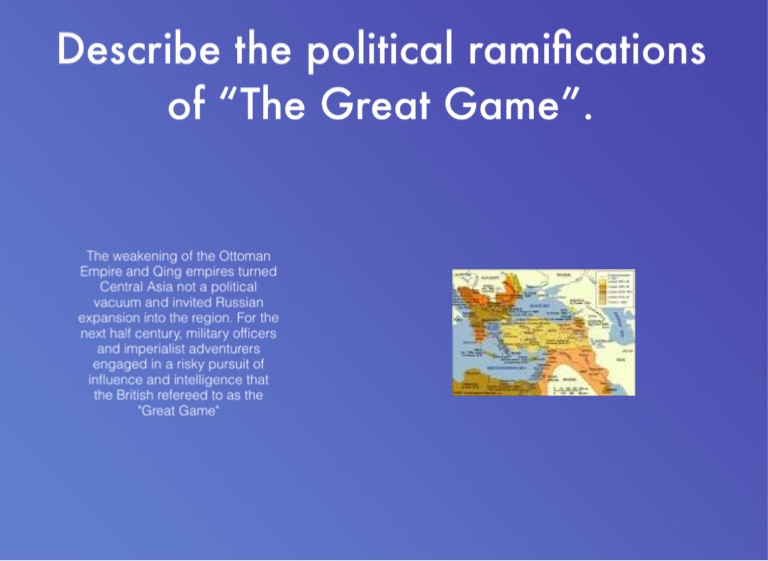 The weakening of the Ottoman Empire and Qing empires turned Central Asia not a political vacuum and invited Russian expansion into the region. For the next half century, military officers and imperialist adventurers engaged in a risky pursuit of influence and intelligence that the British refereed to as the "Great Game"