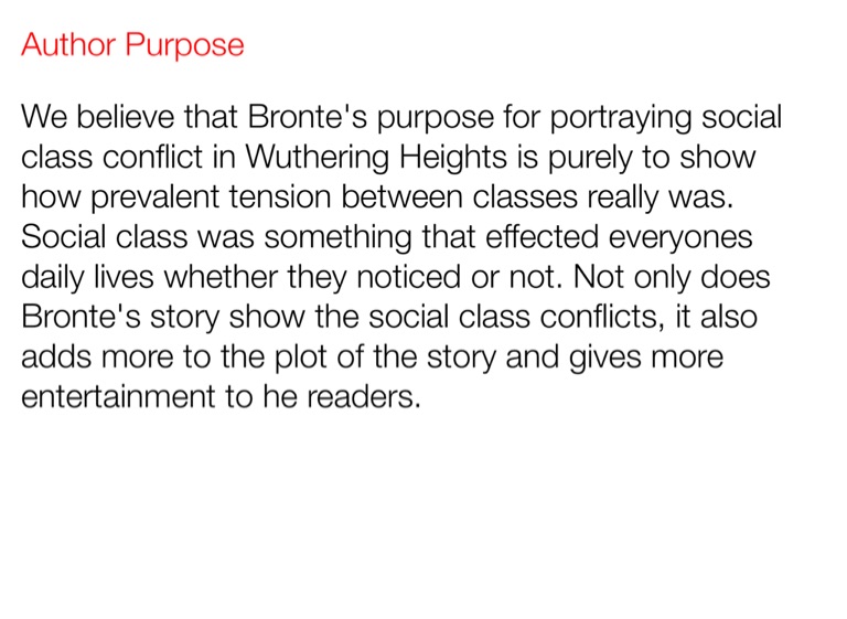 We believe that Bronte's purpose for portraying social class conflict in Wuthering Heights is purely to show how prevalent tension between classes really was. Social class was something that effected everyones daily lives whether they noticed or not. Not only does Bronte's story show the social class conflicts, it also adds more to the plot of the story and gives more entertainment to he readers.