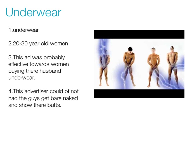 1.underwear 2.20-30 year old women 3.This ad was probably effective towards women buying there husband underwear. 4.This advertiser could of not had the guys get bare naked and show there butts.