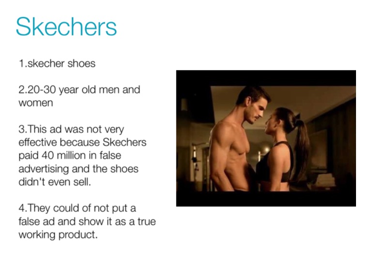1.skecher shoes 2.20-30 year old men and women 3.This ad was not very effective because Skechers paid 40 million in false advertising and the shoes didn't even sell. 4.They could of not put a false ad and show it as a true working product.