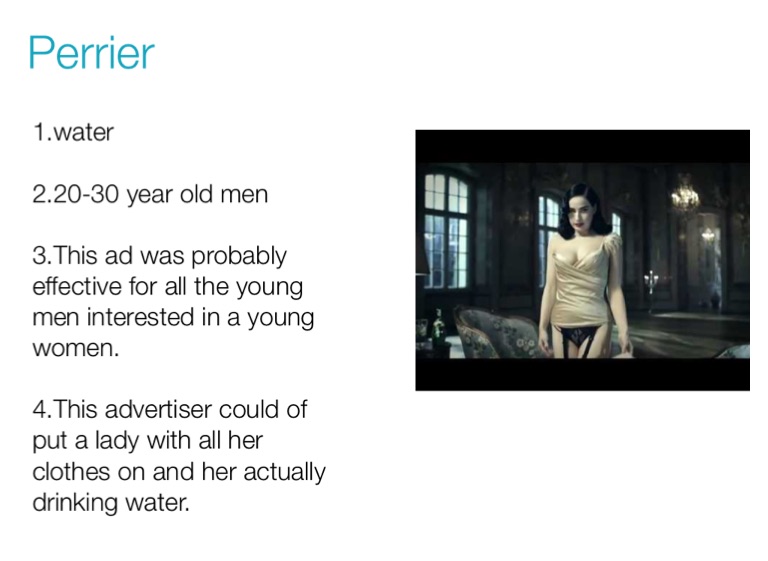 1.water 2.20-30 year old men 3.This ad was probably effective for all the young men interested in a young women. 4.This advertiser could of put a lady with all her clothes on and her actually drinking water.