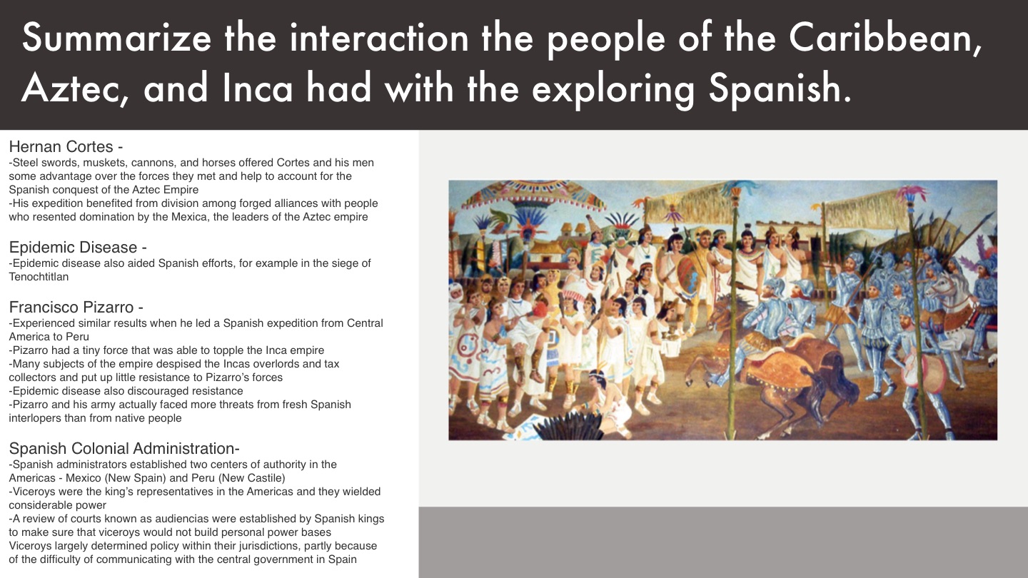 Summarize the interaction the people of the Caribbean, Aztec, and Inca had with the exploring Spanish.