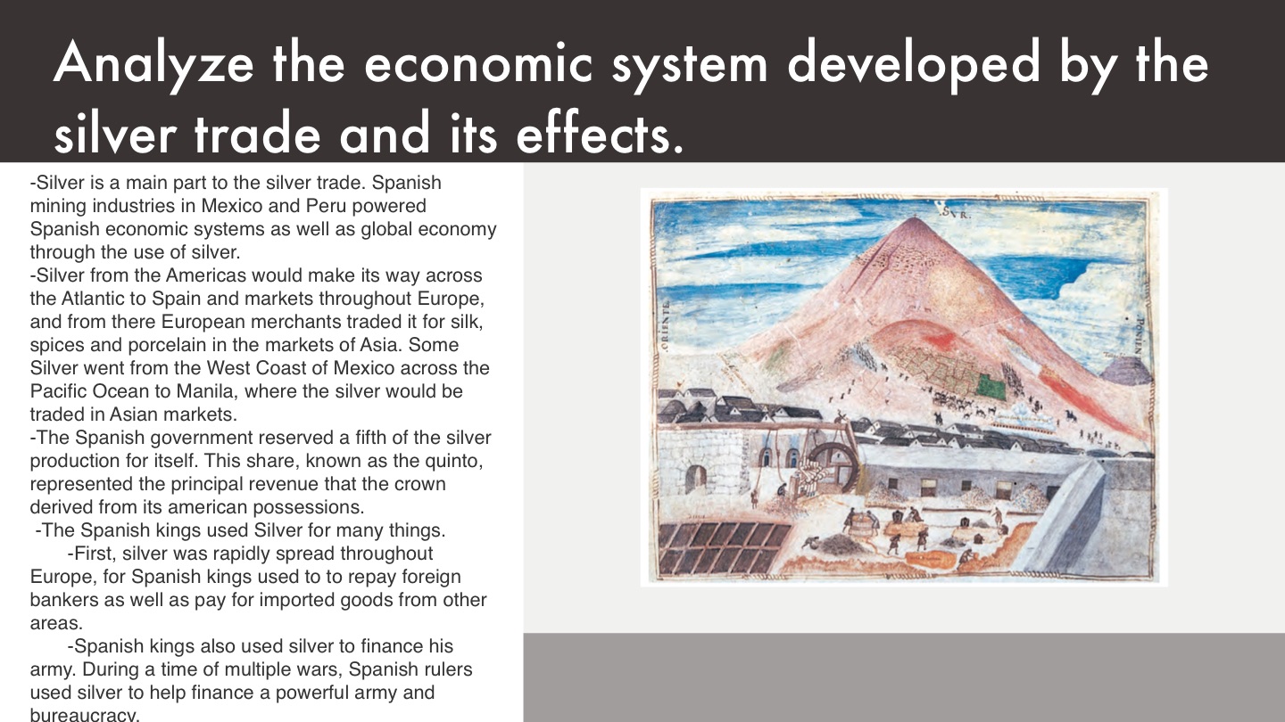 -Silver is a main part to the silver trade. Spanish mining industries in Mexico and Peru powered Spanish economic systems as well as global economy through the use of silver.
