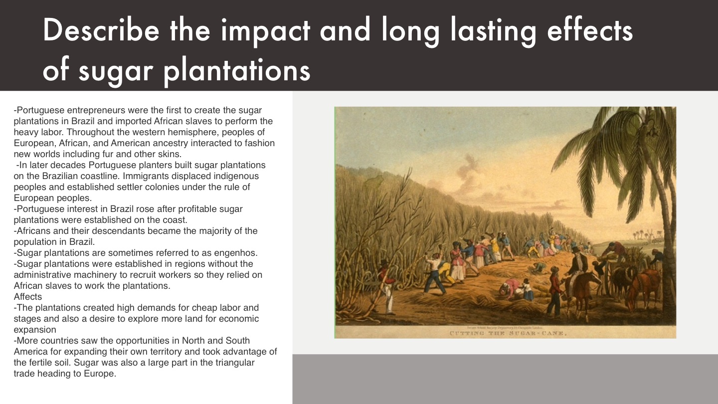 -Sugar plantations were established in regions without the administrative machinery to recruit workers so they relied on African slaves to work the plantations.
