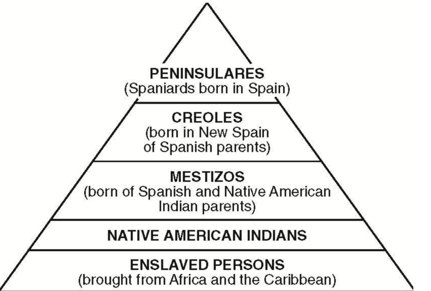 Creoles: Creoles were the next level of society, and they were those people directly descended from Spanish blood but born in the colonies.