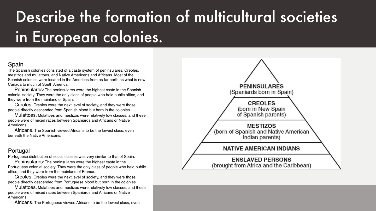 The Spanish colonies consisted of a caste system of peninsulares, Creoles, mestizos and mulattoes, and Native Americans and Africans. Most of the Spanish colonies were located in the Americas from as far north as what is now Canada to much of South America.