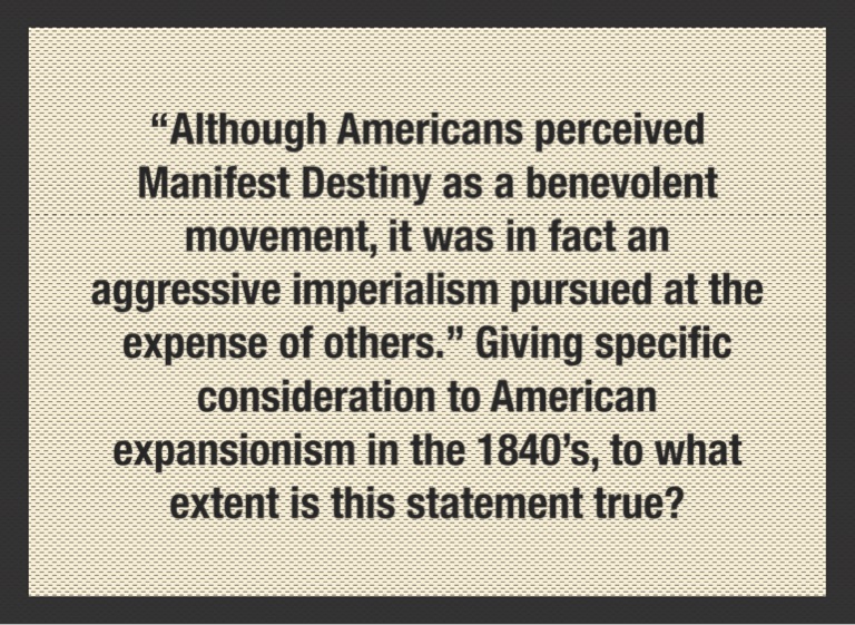“Although Americans perceived Manifest Destiny as a benevolent movement, it was in fact an aggressive imperialism pursued at the expense of others.” Giving specific consideration to American expansionism in the 1840’s, to what extent is this statement true?
