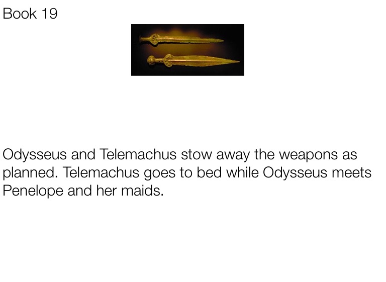 Odysseus and Telemachus stow away the weapons as planned. Telemachus goes to bed while Odysseus meets Penelope and her maids.