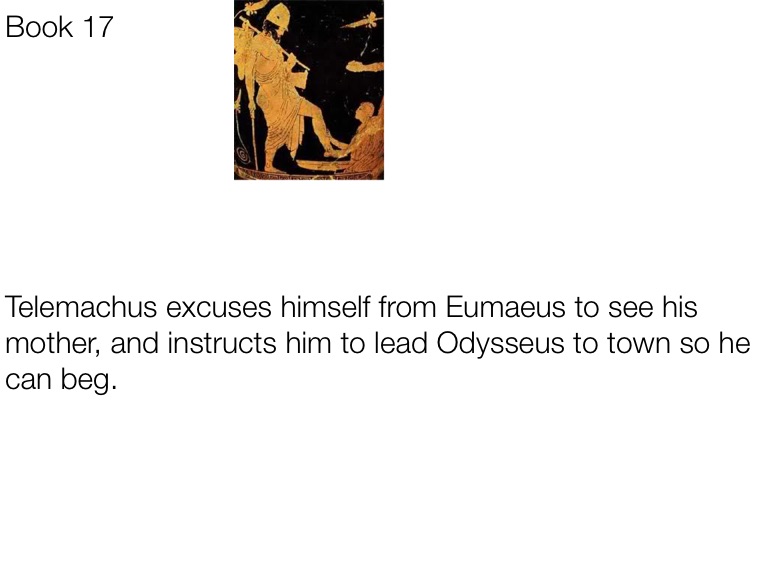 Telemachus excuses himself from Eumaeus to see his mother, and instructs him to lead Odysseus to town so he can beg.