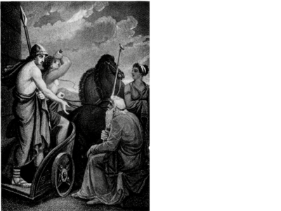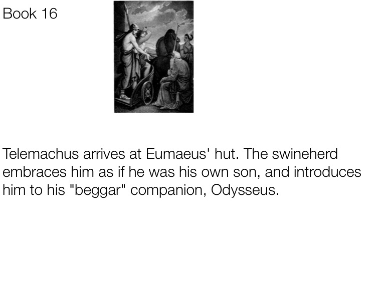 Telemachus arrives at Eumaeus' hut. The swineherd embraces him as if he was his own son, and introduces him to his "beggar" companion, Odysseus.
