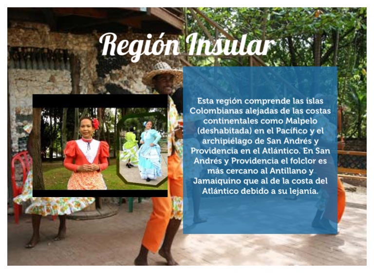 Esta región comprende las islas Colombianas alejadas de las costas continentales como Malpelo (deshabitada) en el Pacífico y el archipiélago de San Andrés y Providencia en el Atlántico. En San Andrés y Providencia el folclor es más cercano al Antillano y Jamaiquino que al de la costa del Atlántico debido a su lejanía.