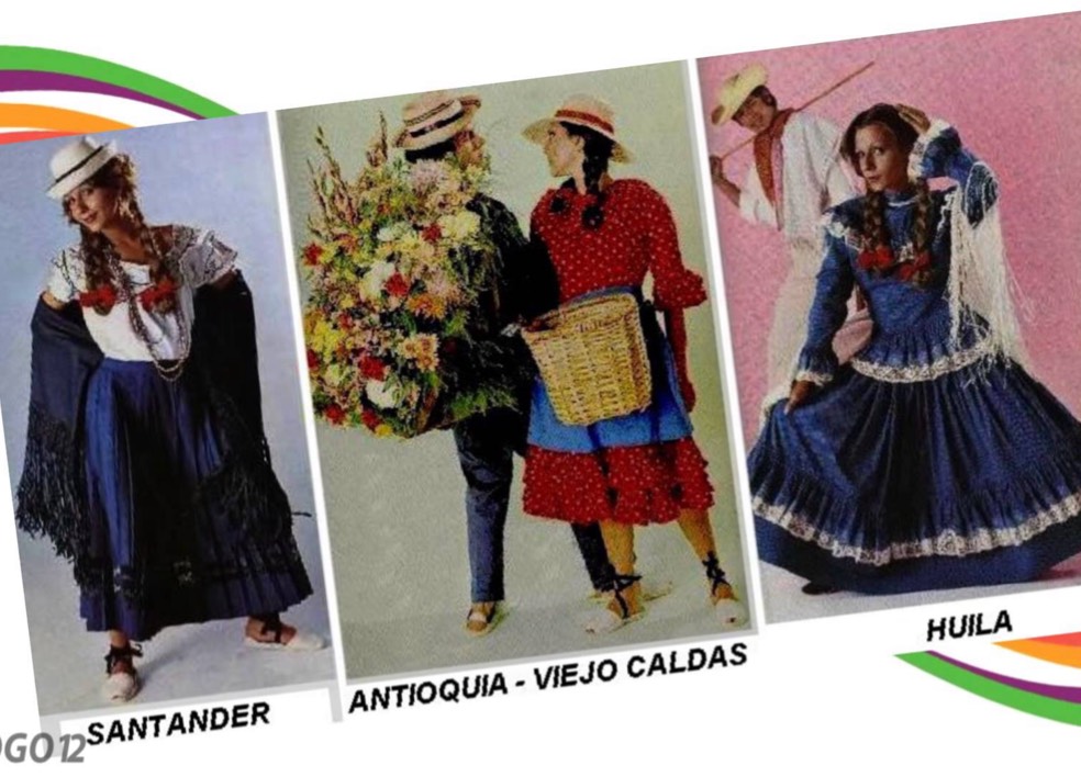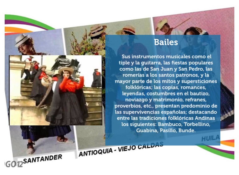 Sus instrumentos musicales como el tiple y la guitarra, las fiestas populares como las de San Juan y San Pedro, las romerías a los santos patronos, y la mayor parte de los mitos y supersticiones folklóricas; las copias, romances, leyendas, costumbres en el bautizo, noviazgo y matrimonio, refranes, proverbios, etc., presentan predominio de las supervivencias españolas; destacando entre las tradiciones folklóricas Andinas los siguientes: Bambuco, Torbellino, Guabina, Pasillo, Bunde.