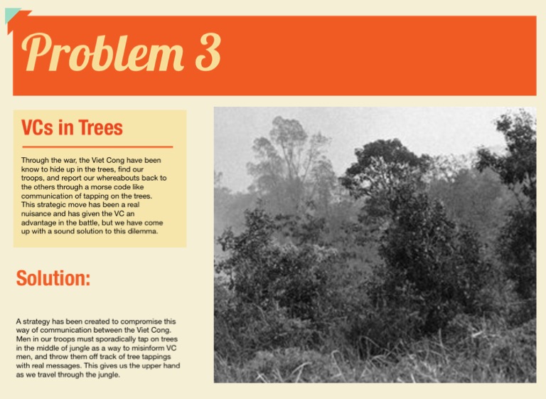 Through the war, the Viet Cong have been know to hide up in the trees, find our troops, and report our whereabouts back to the others through a morse code like communication of tapping on the trees. This strategic move has been a real nuisance and has given the VC an advantage in the battle, but we have come up with a sound solution to this dilemma.