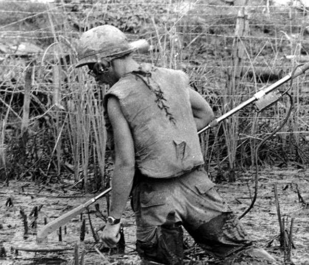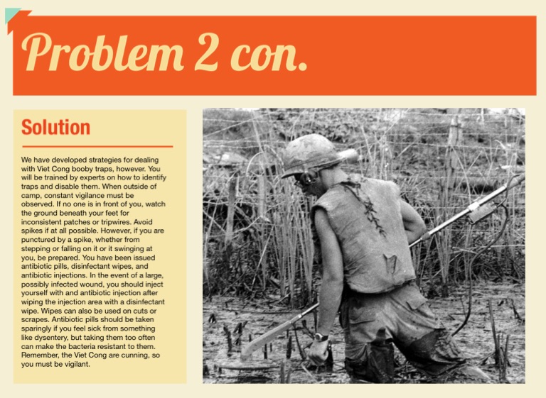 We have developed strategies for dealing with Viet Cong booby traps, however. You will be trained by experts on how to identify traps and disable them. When outside of camp, constant vigilance must be observed. If no one is in front of you, watch the ground beneath your feet for inconsistent patches or tripwires. Avoid spikes if at all possible. However, if you are punctured by a spike, whether from stepping or falling on it or it swinging at you, be prepared. You have been issued antibiotic pills, disinfectant wipes, and antibiotic injections. In the event of a large, possibly infected wound, you should inject yourself with and antibiotic injection after wiping the injection area with a disinfectant wipe. Wipes can also be used on cuts or scrapes. Antibiotic pills should be taken sparingly if you feel sick from something like dysentery, but taking them too often can make the bacteria resistant to them. Remember, the Viet Cong are cunning, so you must be vigilant.