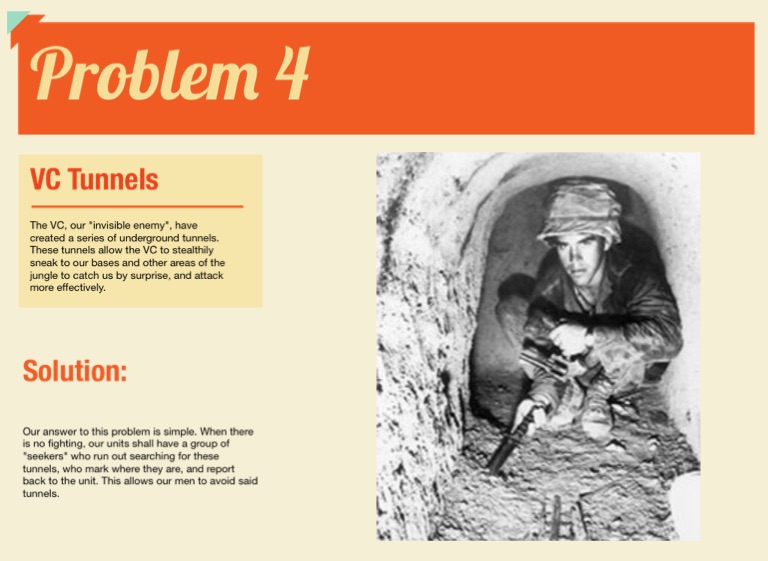 The VC, our "invisible enemy", have created a series of underground tunnels. These tunnels allow the VC to stealthily sneak to our bases and other areas of the jungle to catch us by surprise, and attack more effectively.
