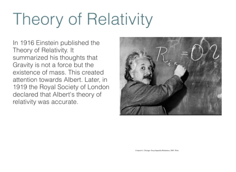 In 1916 Einstein published the Theory of Relativity. It summarized his thoughts that Gravity is not a force but the existence of mass. This created attention towards Albert. Later, in 1919 the Royal Society of London declared that Albert's theory of relativity was accurate.