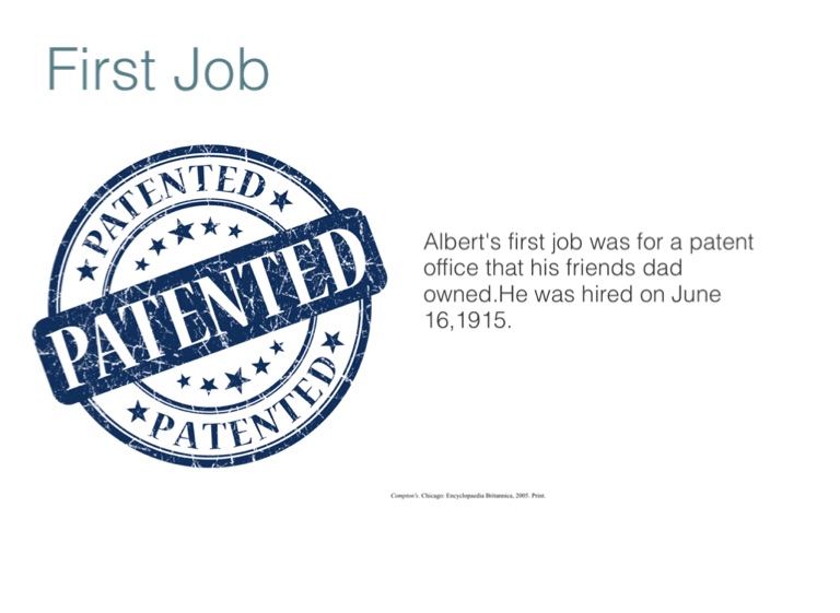Albert's first job was for a patent office that his friends dad owned.He was hired on June 16,1915.