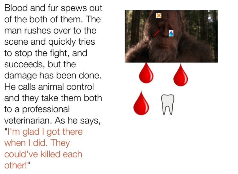 Blood and fur spews out of the both of them. The man rushes over to the scene and quickly tries to stop the fight, and succeeds, but the damage has been done. He calls animal control and they take them both to a professional veterinarian. As he says, "I'm glad I got there when I did. They could've killed each other!"