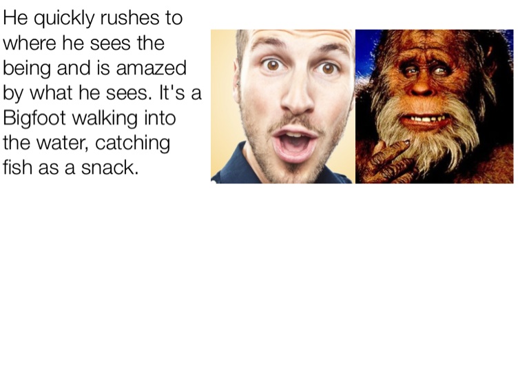 He quickly rushes to where he sees the being and is amazed by what he sees. It's a Bigfoot walking into the water, catching fish as a snack.
